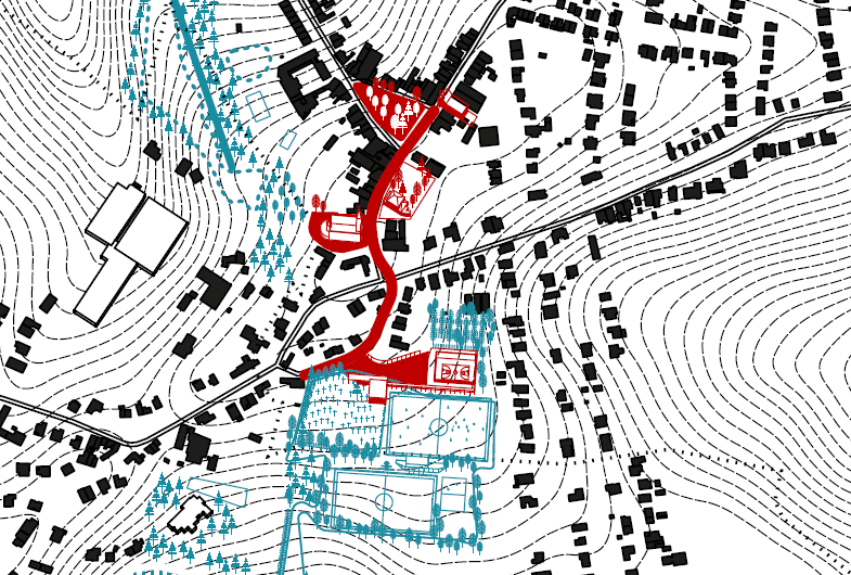 Bij zware regenval verandert het lagergelegen voetbalveld verandert geregeld in een modderpoel. Om dit te verhelpen wordt het vervangen door kunstgras en wordt een waterevacuatie en drainage voorzien. Rond de grote plateaus van het voetbalveld en het kerkhof wordt de nieuwe Finse piste een parelsnoer dat alle functies aan elkaar rijgt: tribune voor voetbalveld, wadi, pleintje voor het kerkhof, buitenfitness, speeltuintje, skatepark, … Het wordt een geweldig interactief loopparcours met veranderende sferen en de kans om ondersteunende functies in het landschap te integreren. OP die manier worden al die aparte toevoegingen samengevoegd tot een geheel.