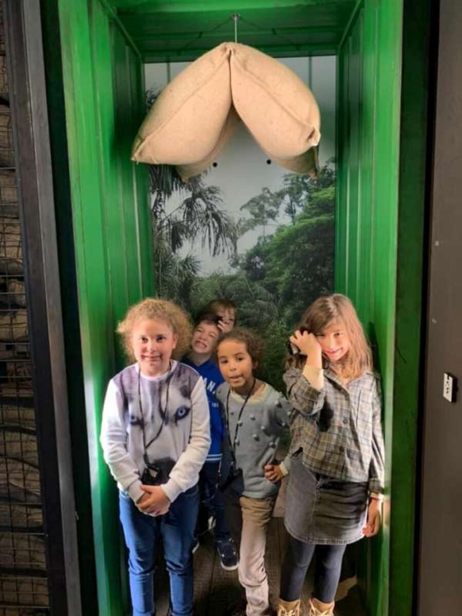 Langs de mond van de rups gingen we de lange rups binnen en langs zijn poep kwamen we terug naar buiten. Dat was keigrappig! Binnenin de rups was het op sommige plaatsen heel donker en werd het parcours heel smal. We moesten door griezelige boogjes kruipen.