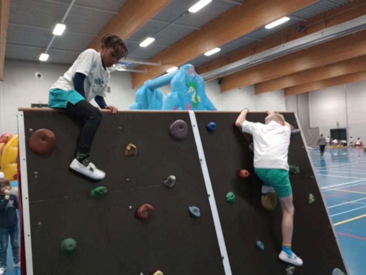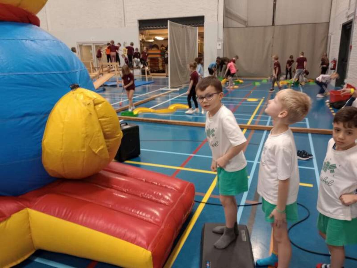 Op het springkasteel konden we klimmen, veel springen en op zeepaardjes zitten. Langs een hoge glijbaan gleden we naar beneden.
