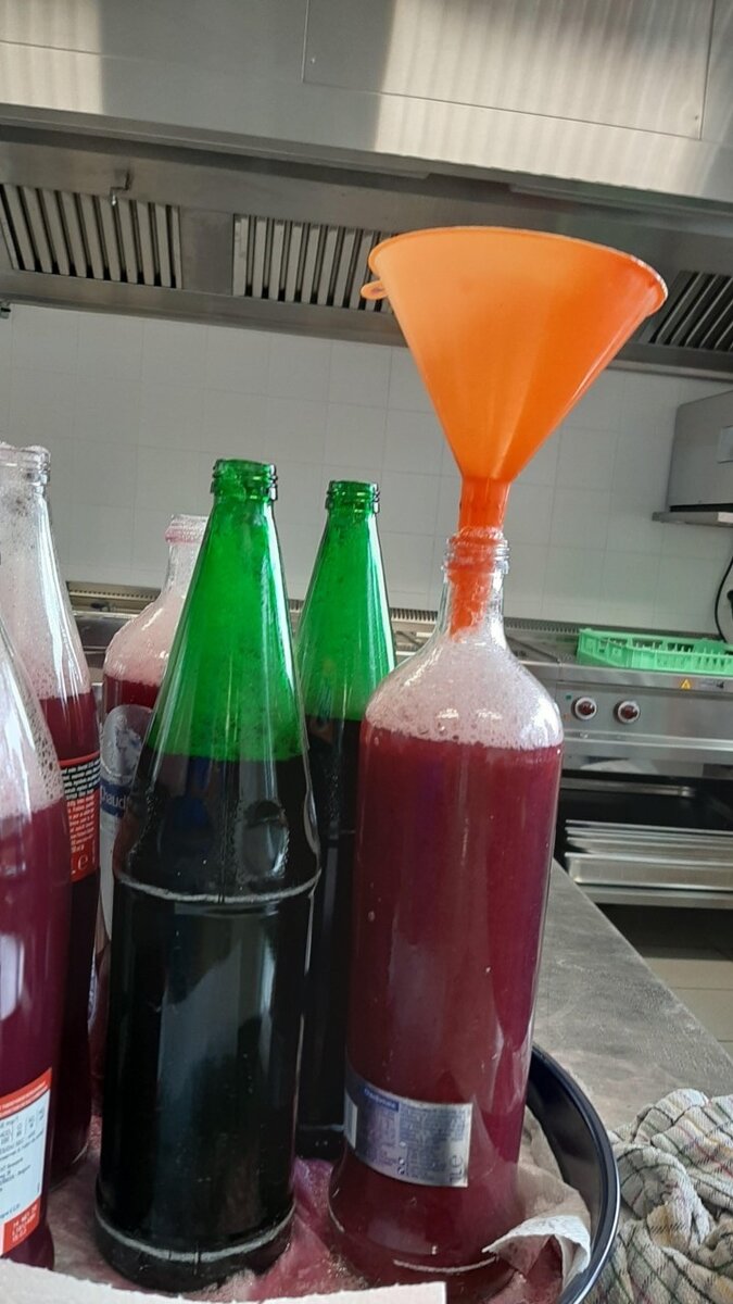 Dan goten we het sap met een trechter in de flessen.