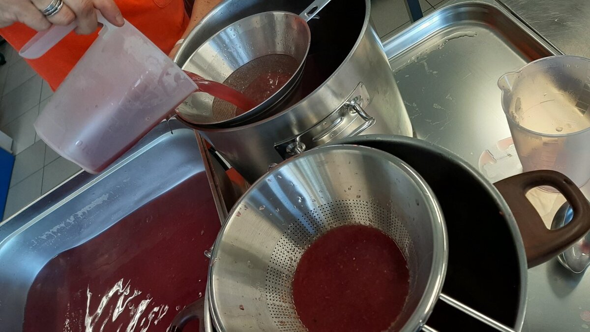 De velletjes gooiden we weg. En we zeefden het sap nog een keer.