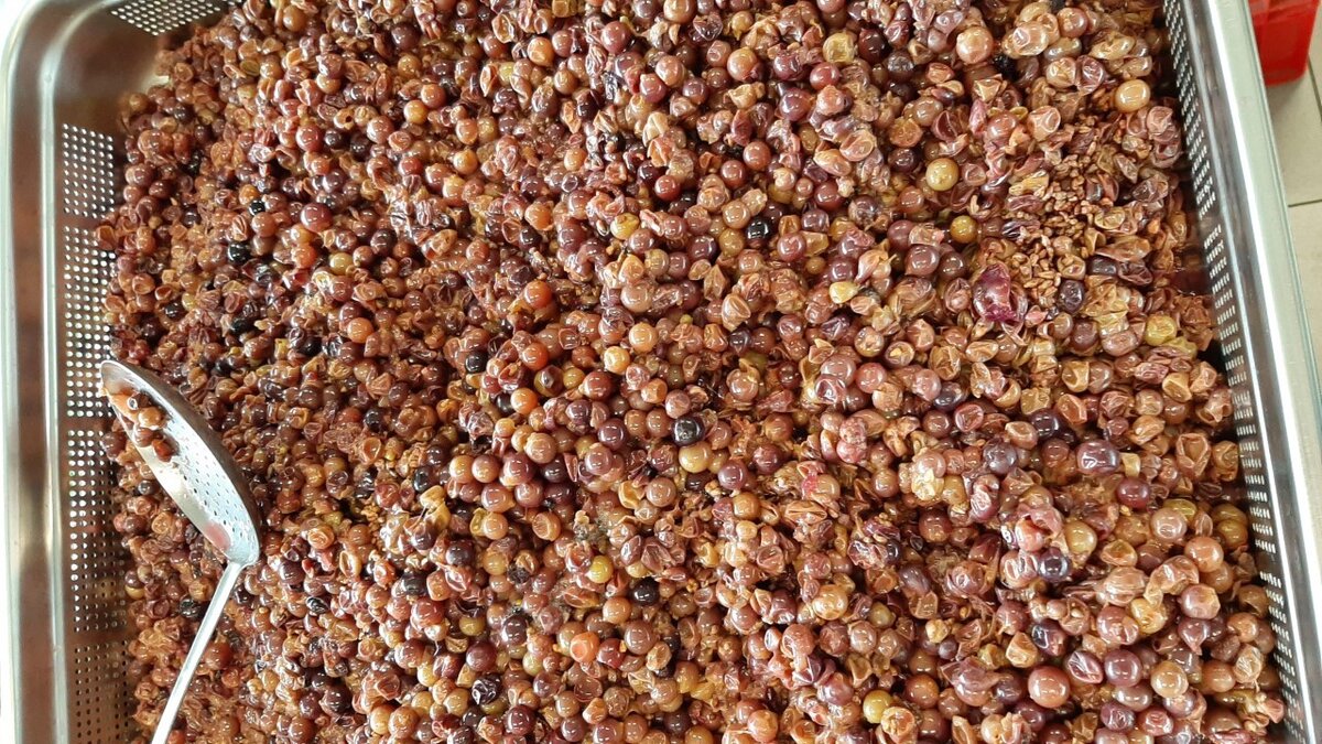 Als de druiven allemaal hun sap hadden afgegeven, zagen we allemaal lege velletjes in de pot drijven.