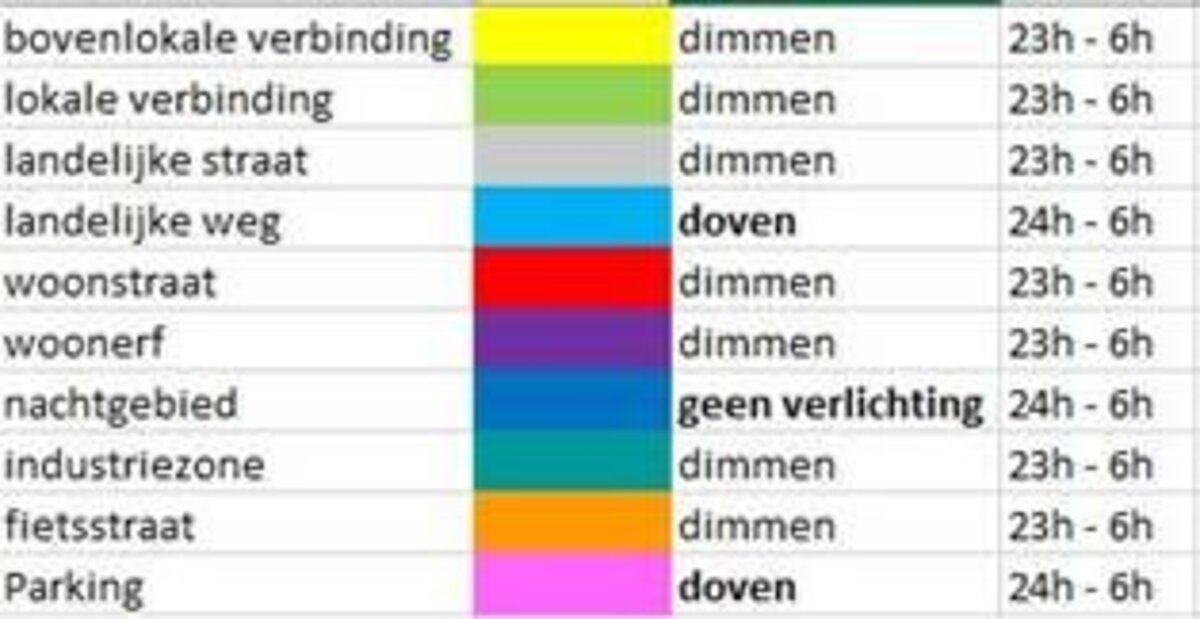 Elke deelruimte kent specifieke eisen wat betreft o.a. de paalhoogte, de armatuur, en de lamp naar sterkte en kleur.