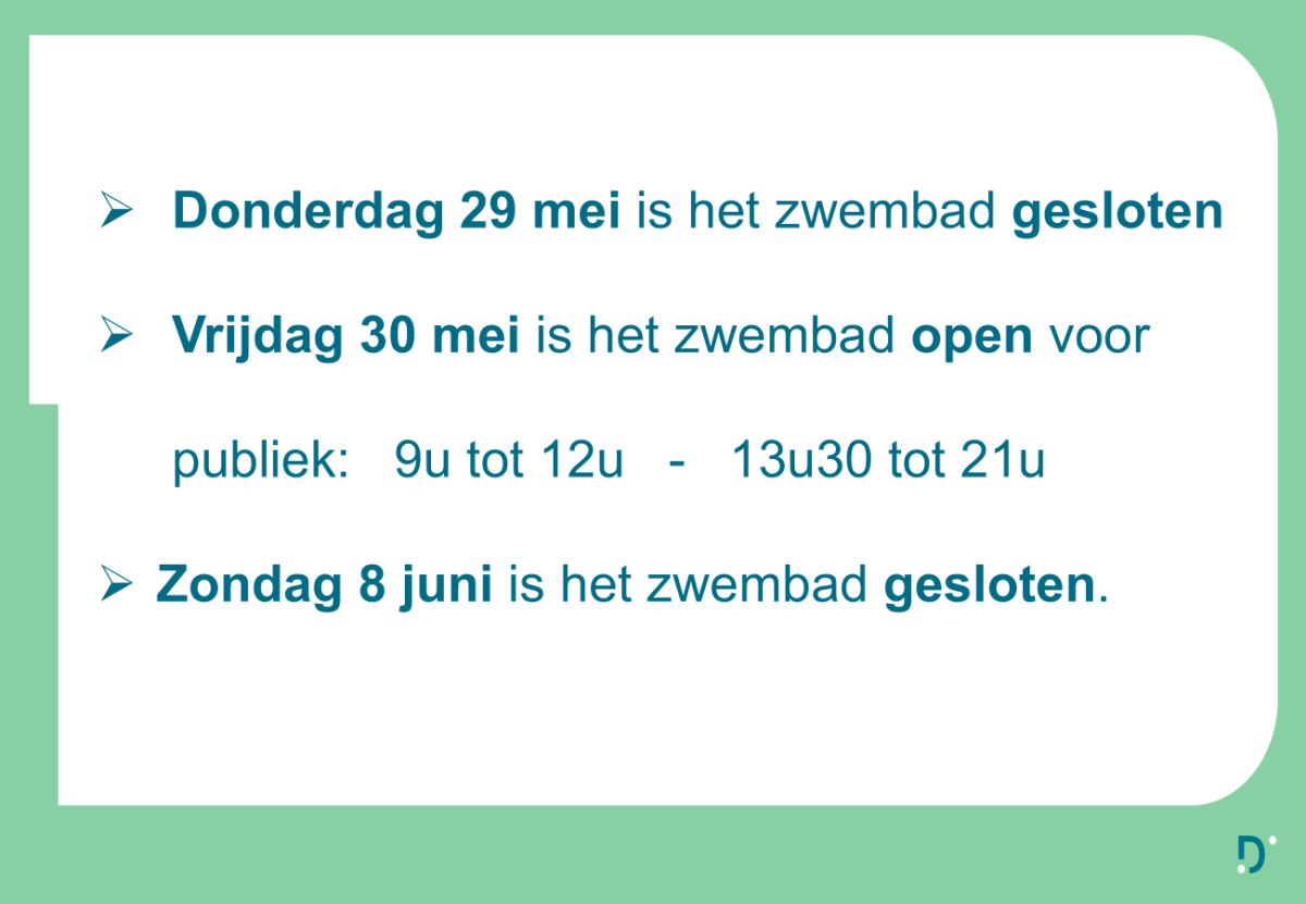 | Woensdag | 07u45 - 08u45 baantjeszwemmen (kassa gesloten) 13u30 - 21u00 publiekzwemmen |